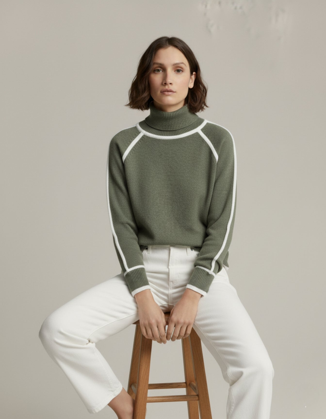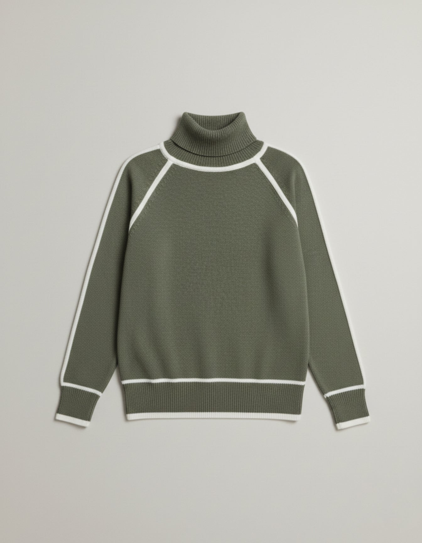 Wytworny golf o klasycznym kroju z wyrazistym, kontrastowym wykończeniem kołnierza, rękawów i dołu. Zaprojektowany z nowoczesnym akcentem, ten sweter łączy ponadczasowe ciepło z eleganckim stylem, dzięki czemu jest uniwersalnym elementem zarówno codziennych, jak i eleganckich stylizacji.