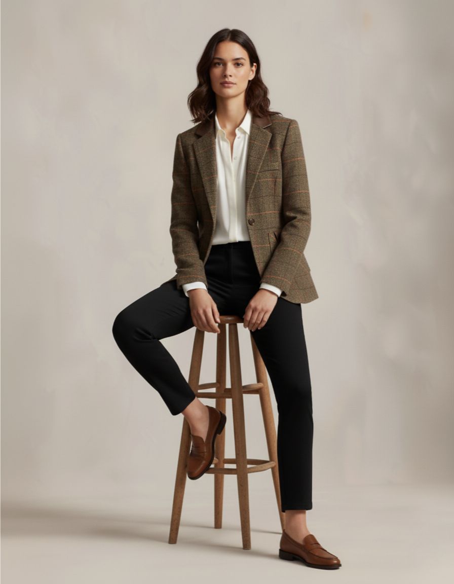 Ponadczasowa marynarka wykonana z wysokiej jakości wełny w tradycyjny wzór kraty glen, wzbogacona nowoczesnym krawiectwem. Zaprojektowana z usztywnioną sylwetką, jednorzędowym zapięciem z przodu i bogatymi skórzanymi wykończeniami przy kołnierzu i kieszeniach, łączy w sobie klasyczną elegancję z nowoczesnym wyrafinowaniem. Stonowane kolory ziemi i subtelna kratka windowpane dodają subtelnej elegancji, a wysokiej jakości konstrukcja gwarantuje długotrwały komfort i styl. Idealna do łączenia z dopasowanymi spodniami lub jeansami, tworząc elegancki, uniwersalny look.